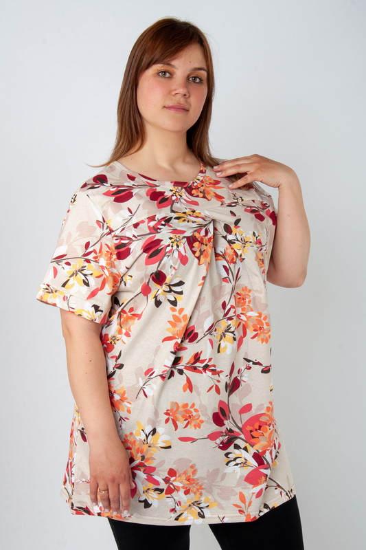 Базова літня туніка жіноча з легкого натурального принтованого куліра-реактиву. Модель прямого силуету, з короткими зручними рукавами, довжиною до коліна, виконана як у яскравих, так і стриманих кольорах. Полотно натуральне, відмінно підходить для спекотного літа. Може давати усадку після прання.