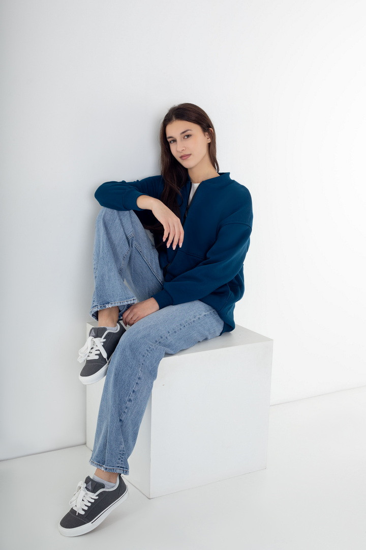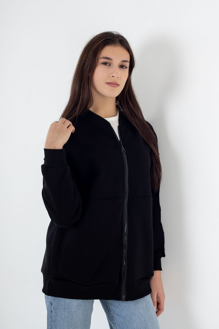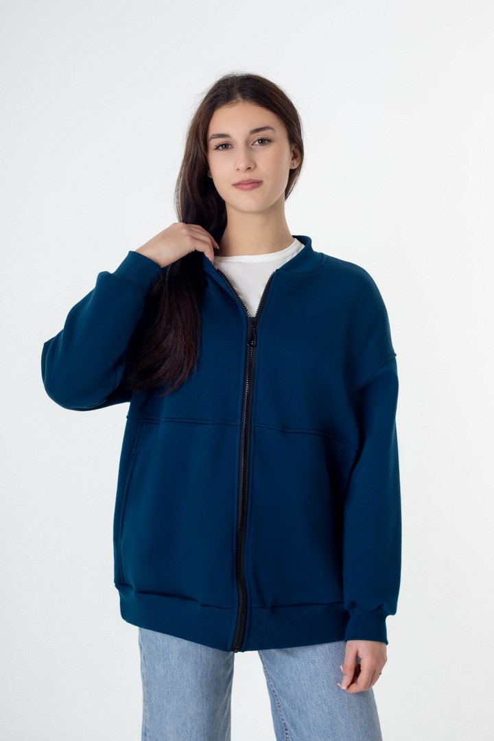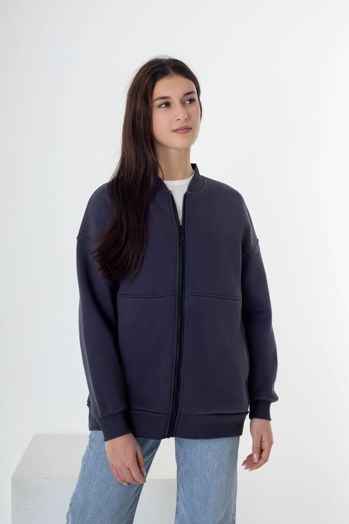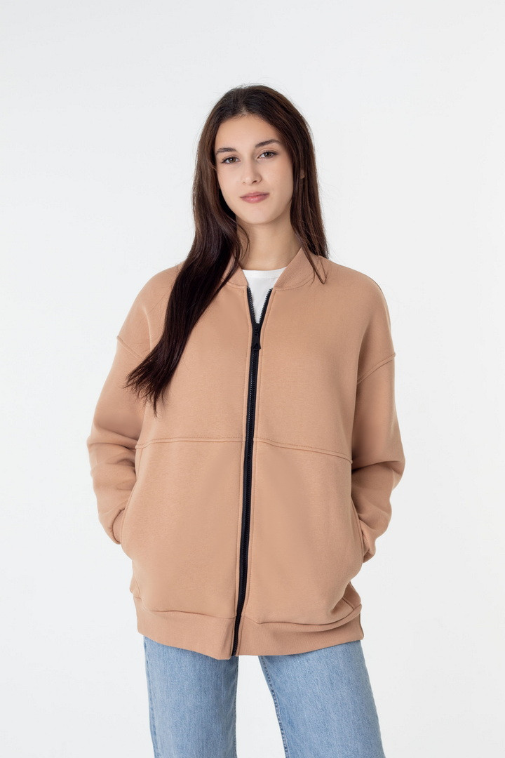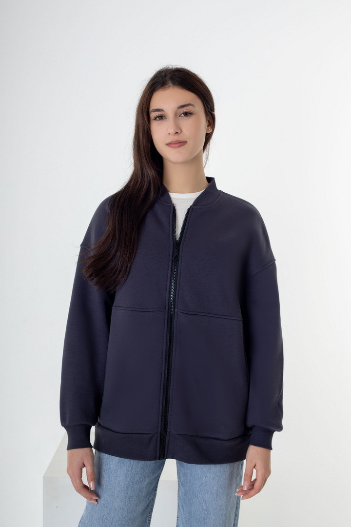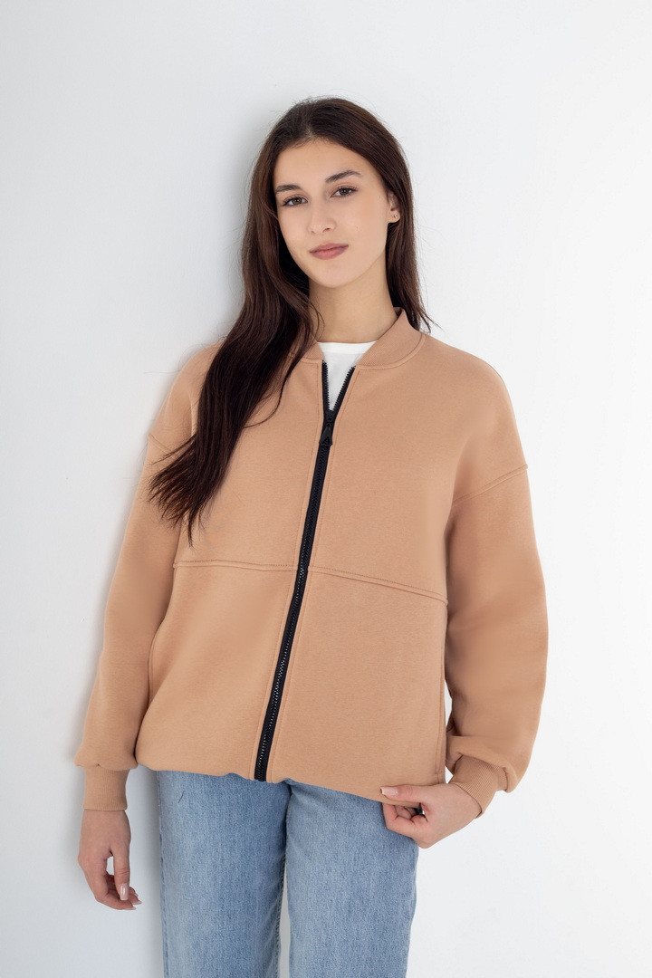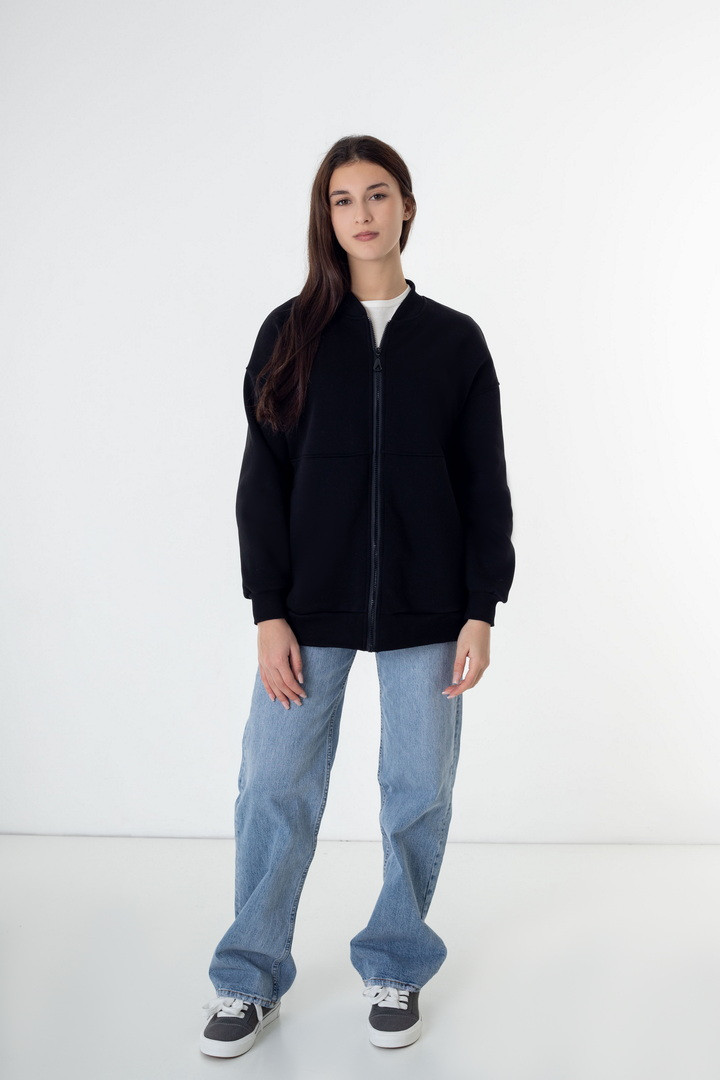 Жіночий бомбер із триниткового футера з начосом — це стильне та практичне рішення для прохолодної погоди, яке поєднує комфорт, тепло та сучасний мінімалістичний дизайн. Модель виконана з щільного триниткового футера з м’яким начосом з внутрішнього боку, що чудово зберігає тепло, приємний до тіла та не подразнює шкіру. Бомбер має прямий вільний крій і підходить для різних типів фігури. Застібка на надійній блискавці по всій довжині забезпечує зручність у використанні та дозволяє легко регулювати посадку. Рукава довгі, зі спущеною лінією плеча, що створює актуальний oversize-ефект. Низ виробу та манжети виконані з еластичної тканини, завдяки чому бомбер добре тримає форму і комфортно сідає. З боків розташовані функціональні кишені, які додають практичності. Ідеальний варіант для осені, весни та прохолодних зимових днів.