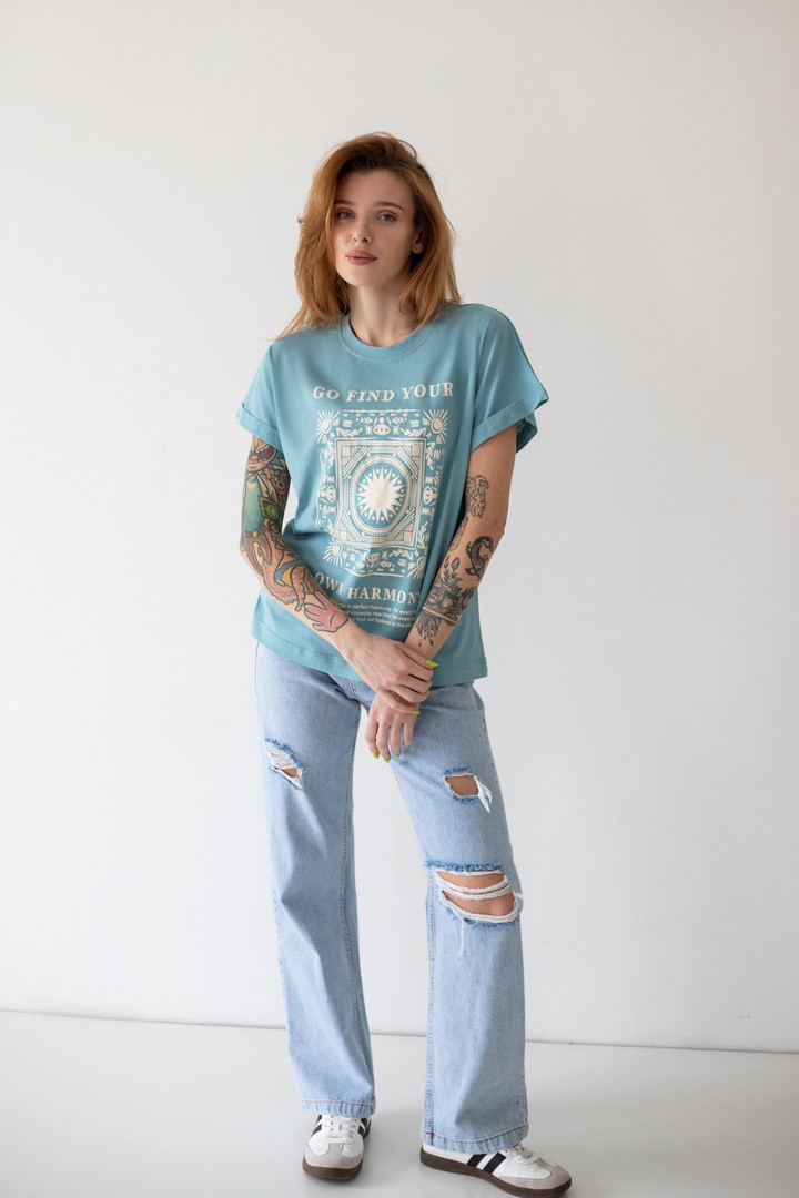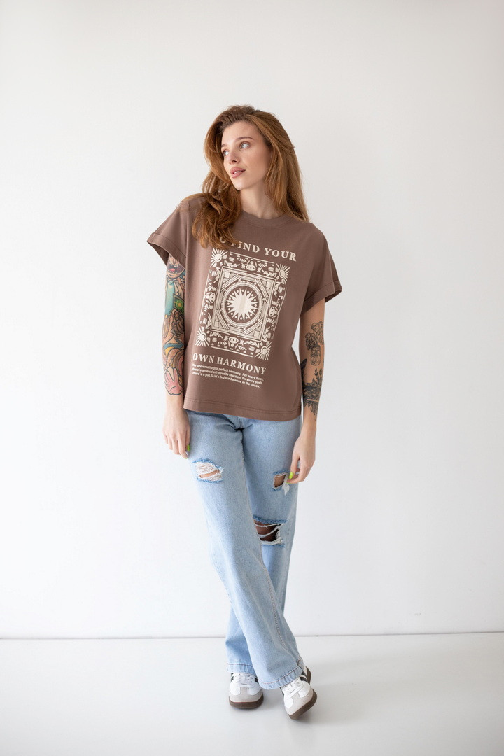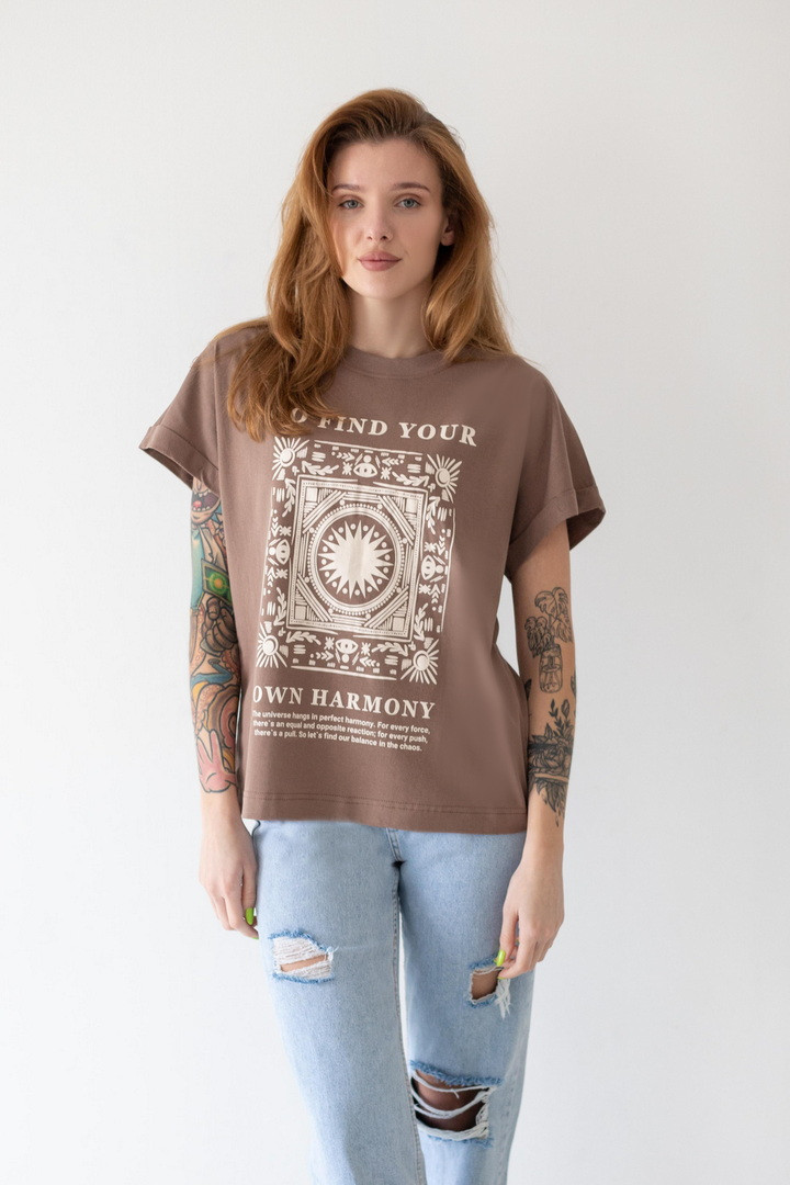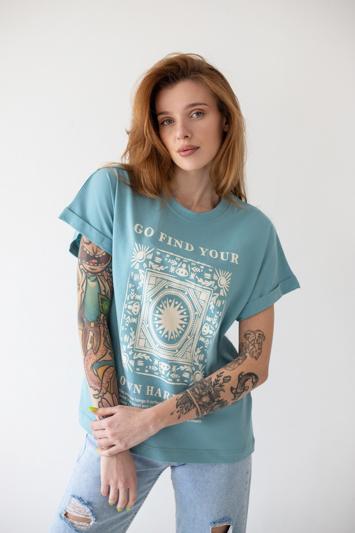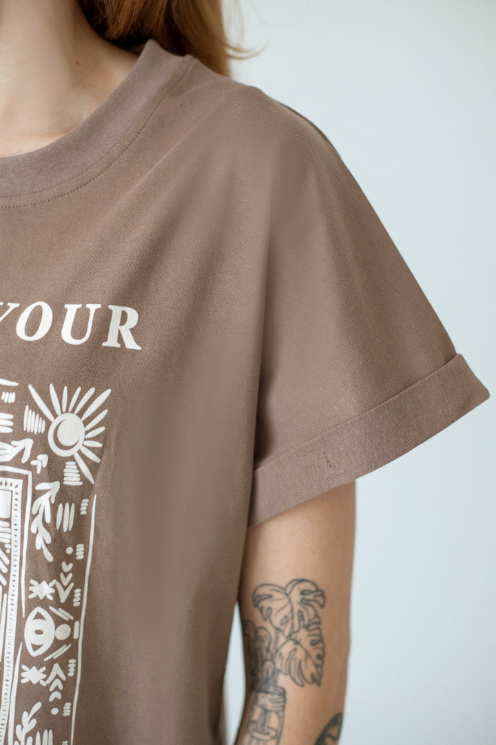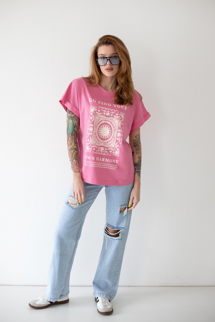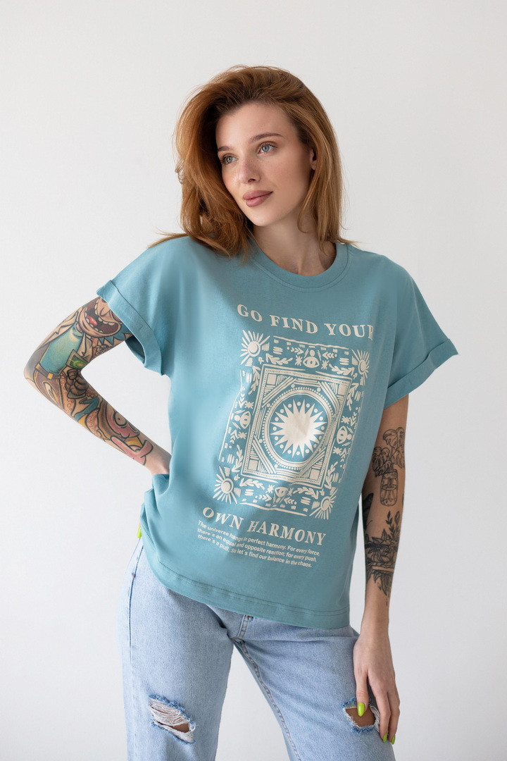 Жіноча футболка з куліру — це ідеальне поєднання стилю, комфорту та внутрішньої гармонії. Вона створена для тих, хто цінує легкість у кожному дотику та сучасний дизайн, що підкреслює індивідуальність. М’яка та приємна до тіла тканина кулір, дарує відчуття ніжності навіть у найспекотніші дні. Це саме той варіант, який хочеться носити щодня — вдома, на прогулянці чи під час активного відпочинку. Вільний крій (oversize) додає образу легкості та невимушеності, підкреслюючи природну красу. Спущена лінія плеча створює трендовий силует, а універсальна довжина дозволяє поєднувати футболку як із джинсами, так і зі шортами чи спідницями. Особливу увагу привертає стильний принт із глибоким змістом — він не просто прикрашає, а передає настрій гармонії, балансу та внутрішньої сили. Така футболка — це не лише базовий елемент гардеробу, а справжній акцент вашого образу. Це вибір для тих, хто хоче виглядати сучасно, почуватися комфортно та нести свій стиль із легкістю та впевненістю.