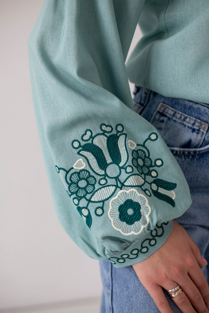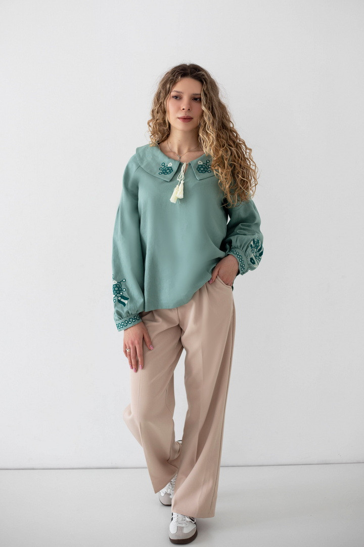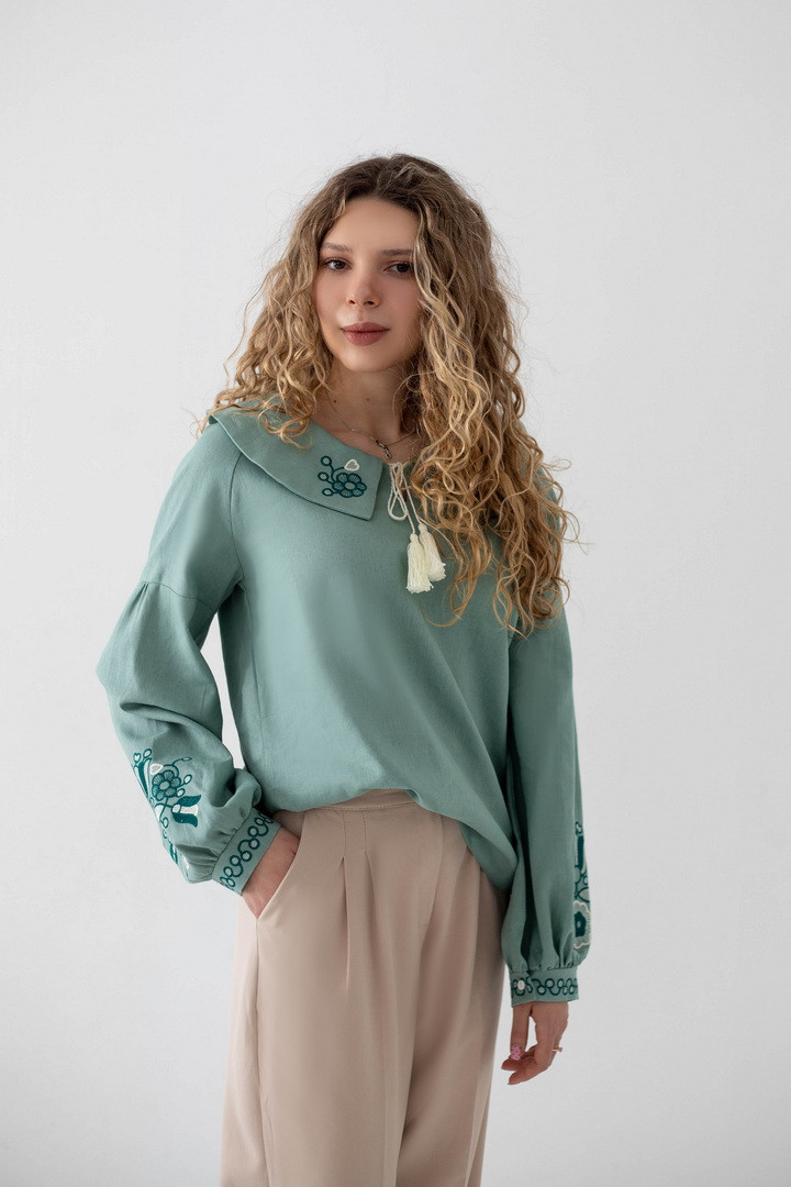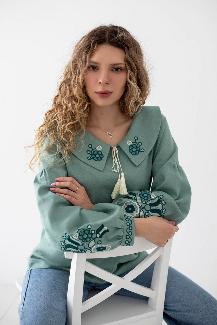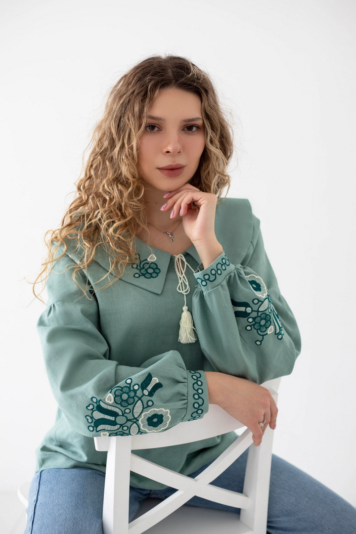 Ця жіноча вишиванка з натурального льону — втілення жіночності, спокою та глибокого українського змісту. Легка, дихаюча тканина дарує комфорт упродовж усього дня, а благородна фактура льону підкреслює натуральність виробу. Вишуканий вільний крій красиво лягає по фігурі і створює відчуття легкості. Акуратний округлий комір зі шнурівкою і декоративними китицями, додає образу ніжності та витонченості. Вишивка з флористичними мотивами на грудях і рукавах виглядає гармонійно та стильно, надаючи образу особливого характеру та національного шарму. Об’ємні рукава з м’якими манжетами, створюють сучасний силует і роблять вишиванку універсальною. Ця вишиванка — не просто одяг, а настрій, історія та любов до українських традицій у сучасному виконанні.