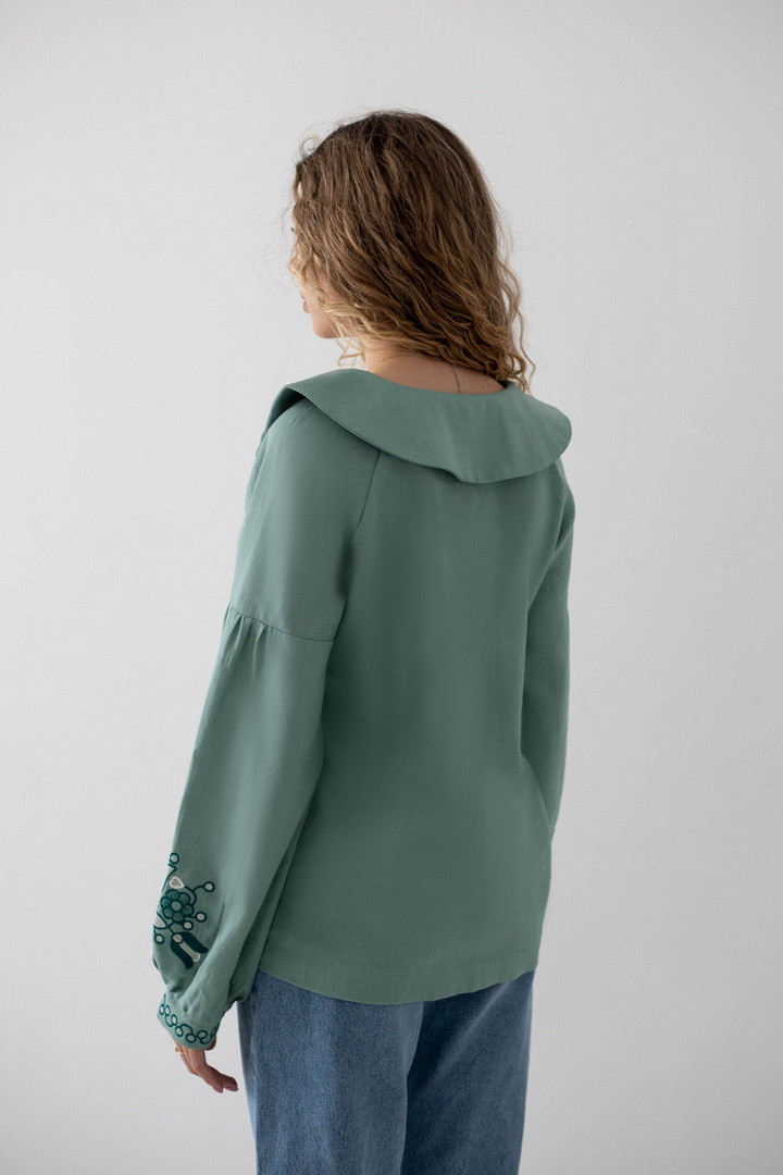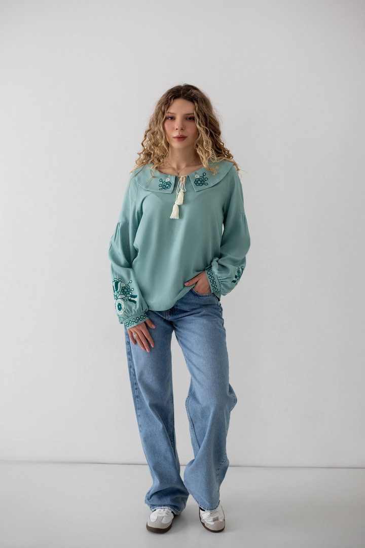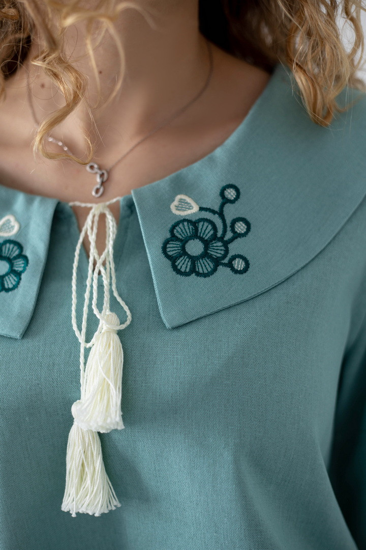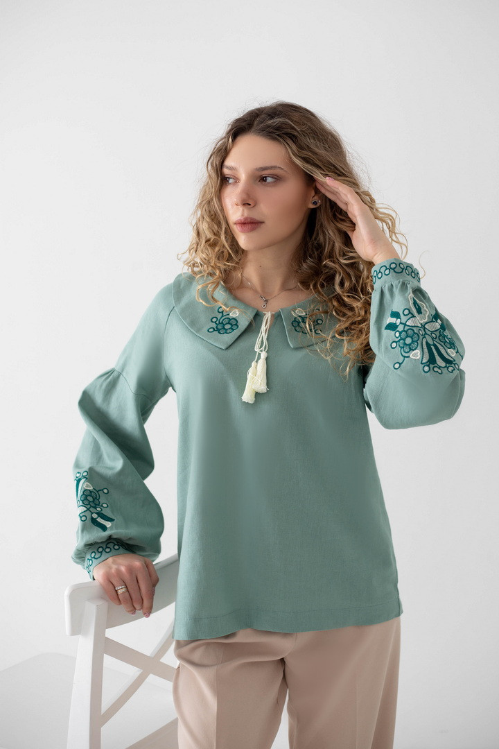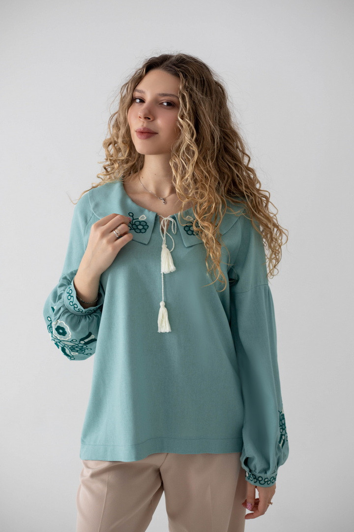 Ця жіноча вишиванка з натурального льону — втілення жіночності, спокою та глибокого українського змісту. Легка, дихаюча тканина дарує комфорт упродовж усього дня, а благородна фактура льону підкреслює натуральність виробу. Вишуканий вільний крій красиво лягає по фігурі і створює відчуття легкості. Акуратний округлий комір зі шнурівкою і декоративними китицями, додає образу ніжності та витонченості. Вишивка з флористичними мотивами на грудях і рукавах виглядає гармонійно та стильно, надаючи образу особливого характеру та національного шарму. Об’ємні рукава з м’якими манжетами, створюють сучасний силует і роблять вишиванку універсальною. Ця вишиванка — не просто одяг, а настрій, історія та любов до українських традицій у сучасному виконанні.