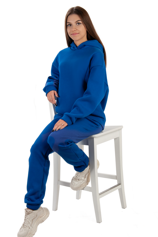 Теплий та комфортний костюм для жінок, виготовлений із полотна "Тринитковий футер з начосом". Модель стильна та практична, складається зі штанів та худі, штани мають по низу широкі еластичні манжети, худі вільного крою, по боках розташовані кармани. Костюм чудово підійде для використання в холодну пору року. Тканина щільна, має густий начіс з виворотної сторони, чудово зберігає тепло.