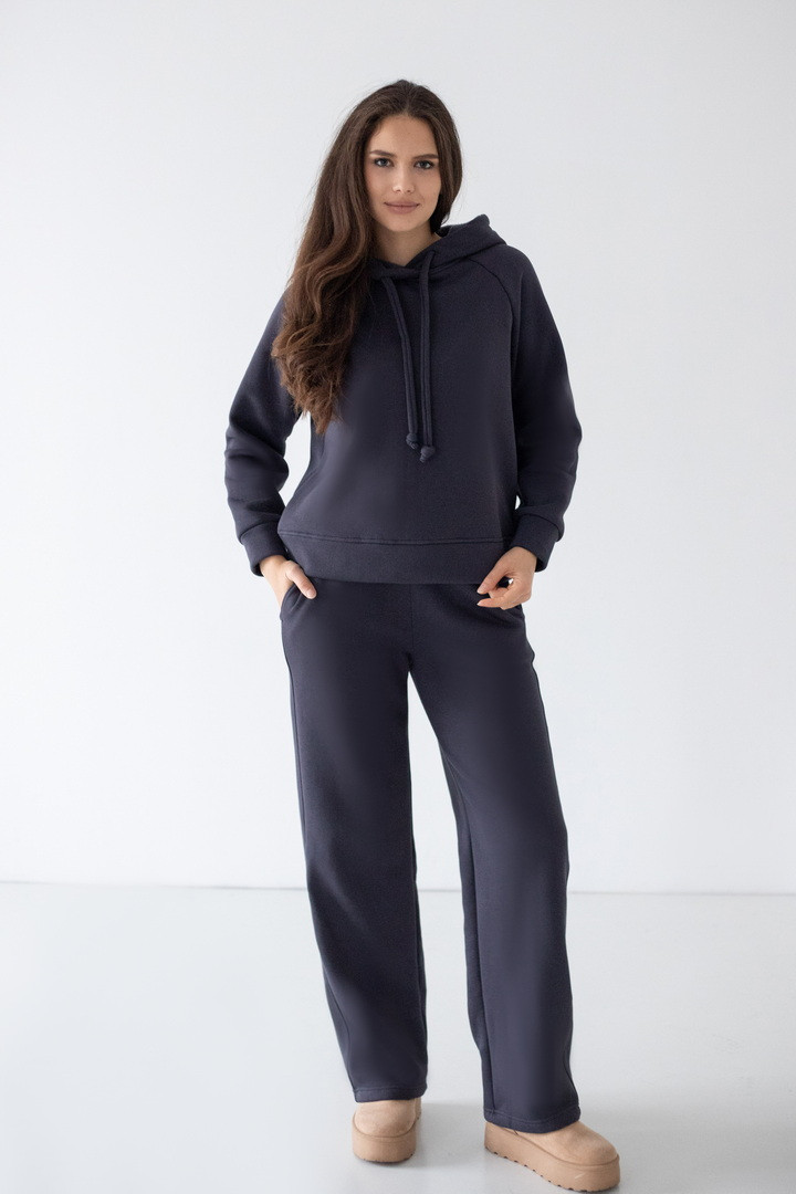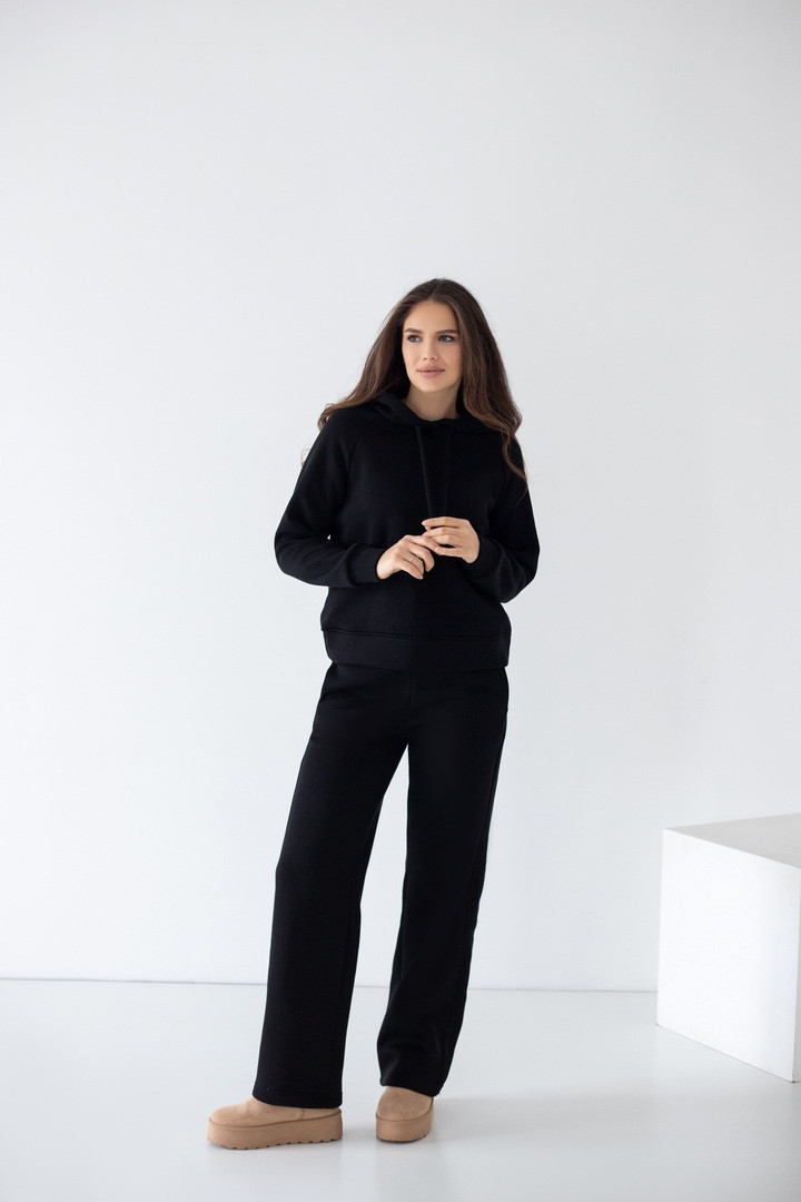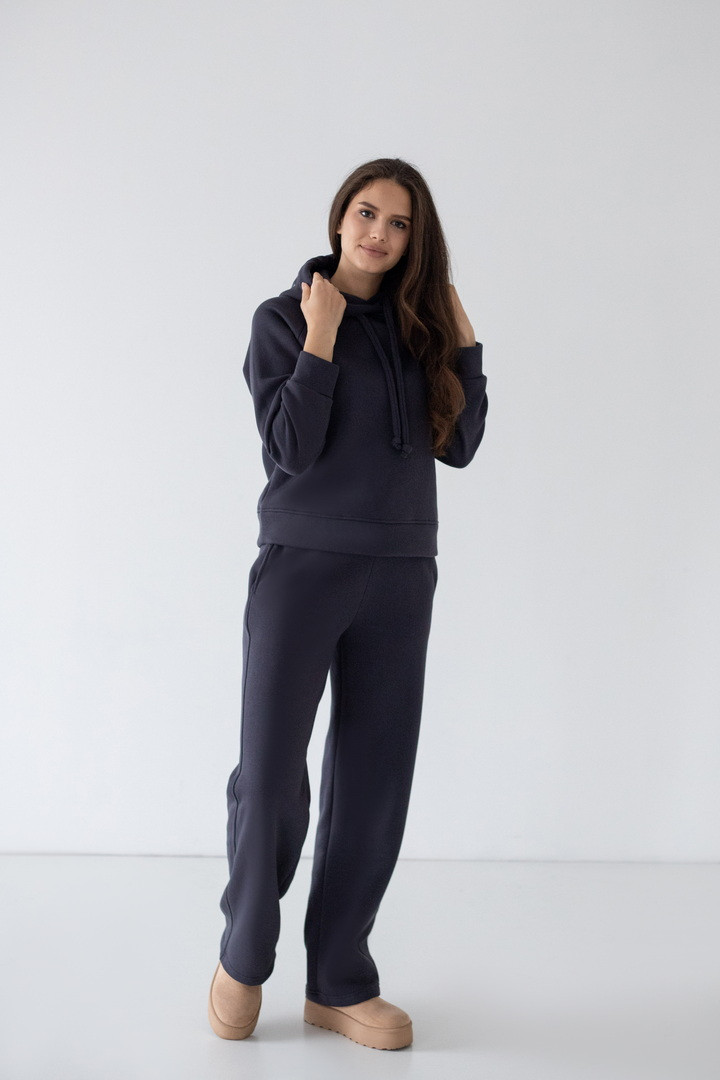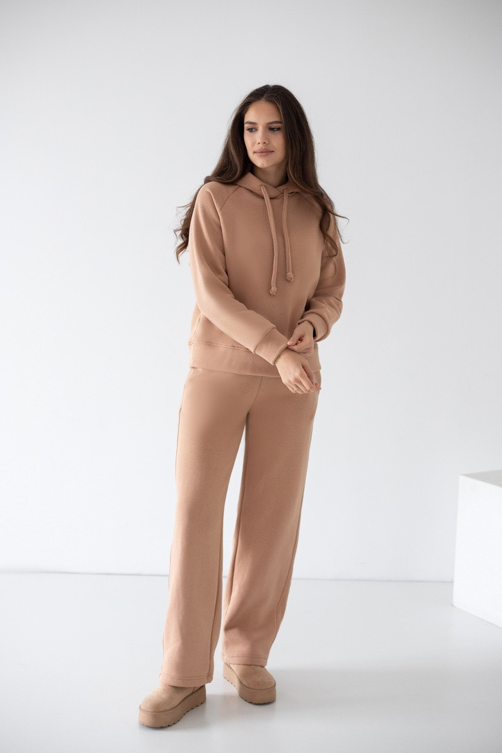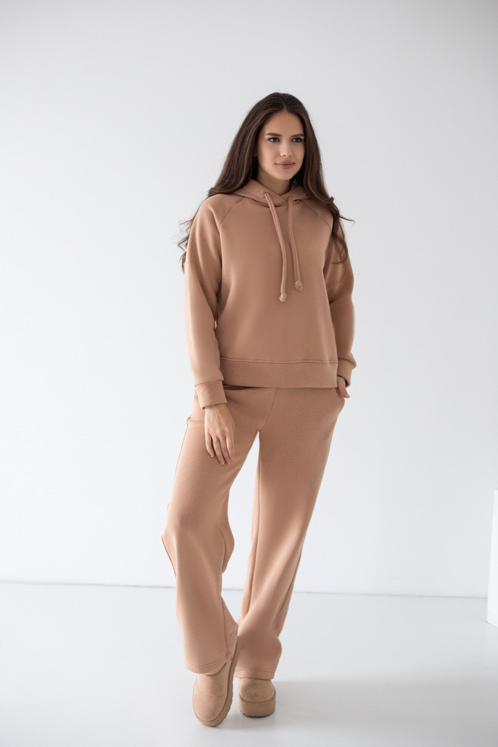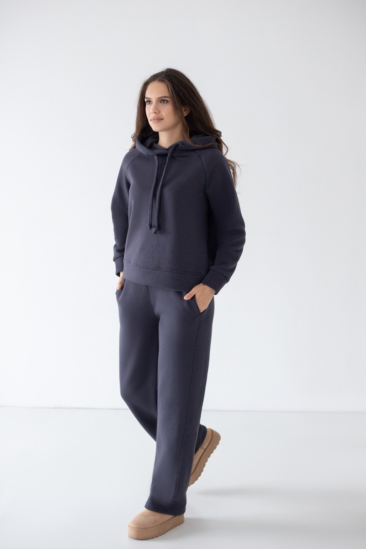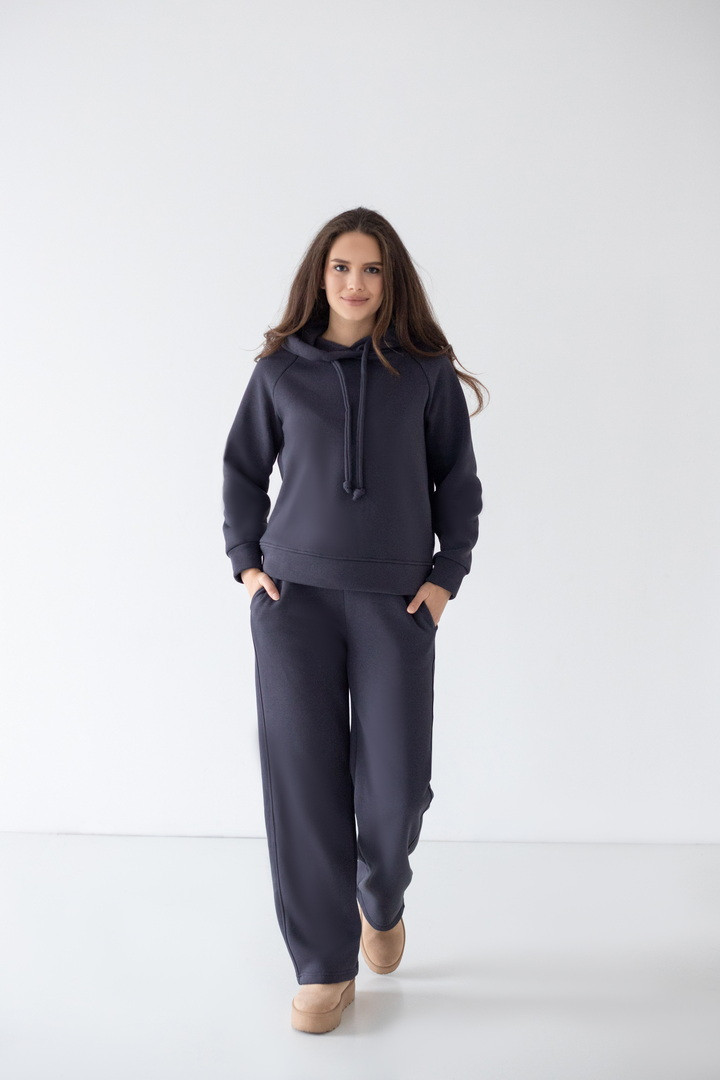 Жіночий костюм — стильний і зручний варіант для повсякденного носіння. Комплект складається з худі з капюшоном і прямими штанами. Тканина — щільна тринитка з начосом, м’яка на дотик, приємна до тіла, добре зберігає форму та забезпечує комфорт у прохолодну погоду. Худі має об’ємний капюшон із зав’язками, спущену лінію плеча та еластичні манжети. Штани з високою посадкою, прямого крою, із зручними кишенями по боках. Такий костюм ідеально підходить для прогулянок, подорожей або домашнього відпочинку, поєднуючи комфорт і сучасний стиль