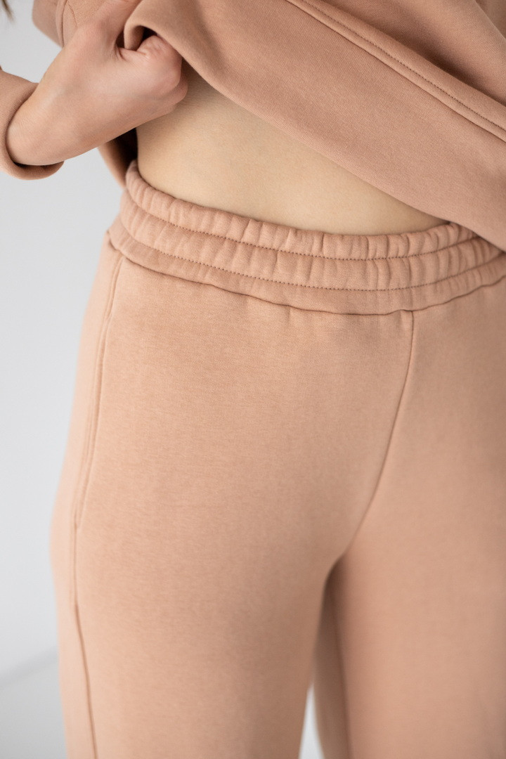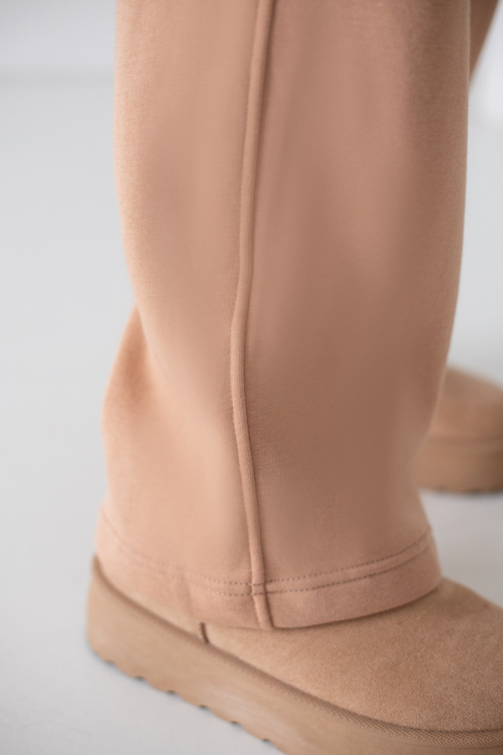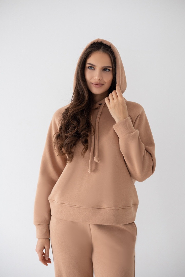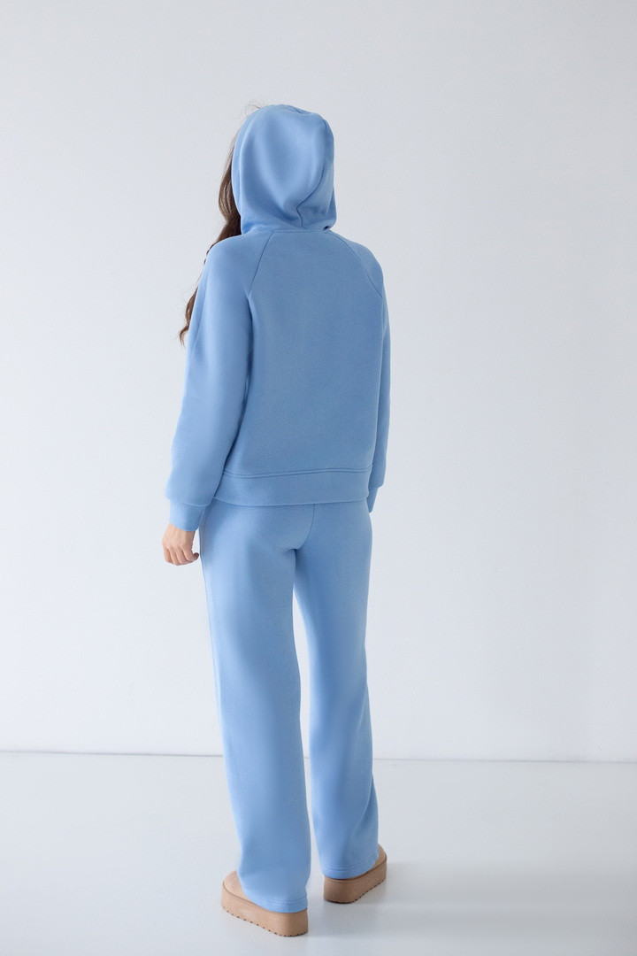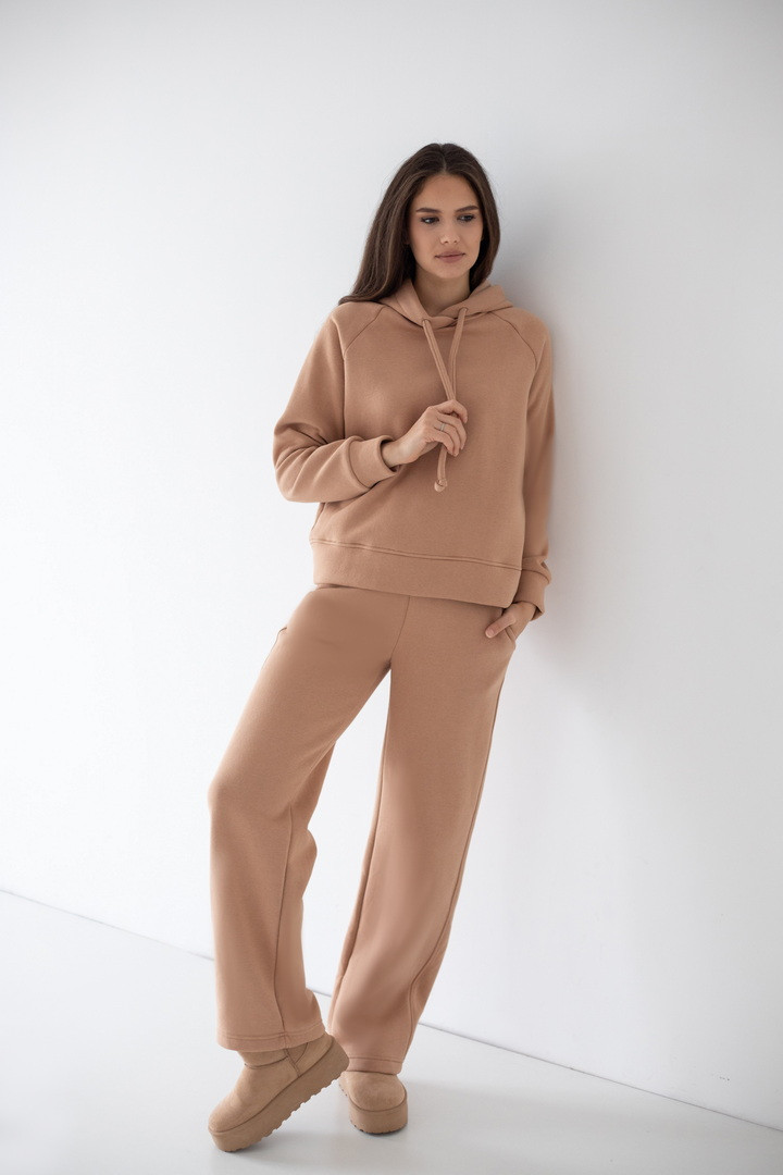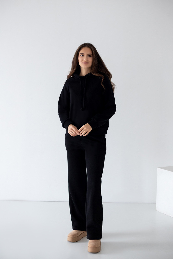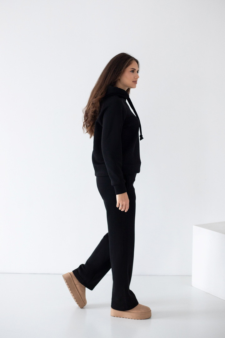 Жіночий костюм — стильний і зручний варіант для повсякденного носіння. Комплект складається з худі з капюшоном і прямими штанами. Тканина — щільна тринитка з начосом, м’яка на дотик, приємна до тіла, добре зберігає форму та забезпечує комфорт у прохолодну погоду. Худі має об’ємний капюшон із зав’язками, спущену лінію плеча та еластичні манжети. Штани з високою посадкою, прямого крою, із зручними кишенями по боках. Такий костюм ідеально підходить для прогулянок, подорожей або домашнього відпочинку, поєднуючи комфорт і сучасний стиль