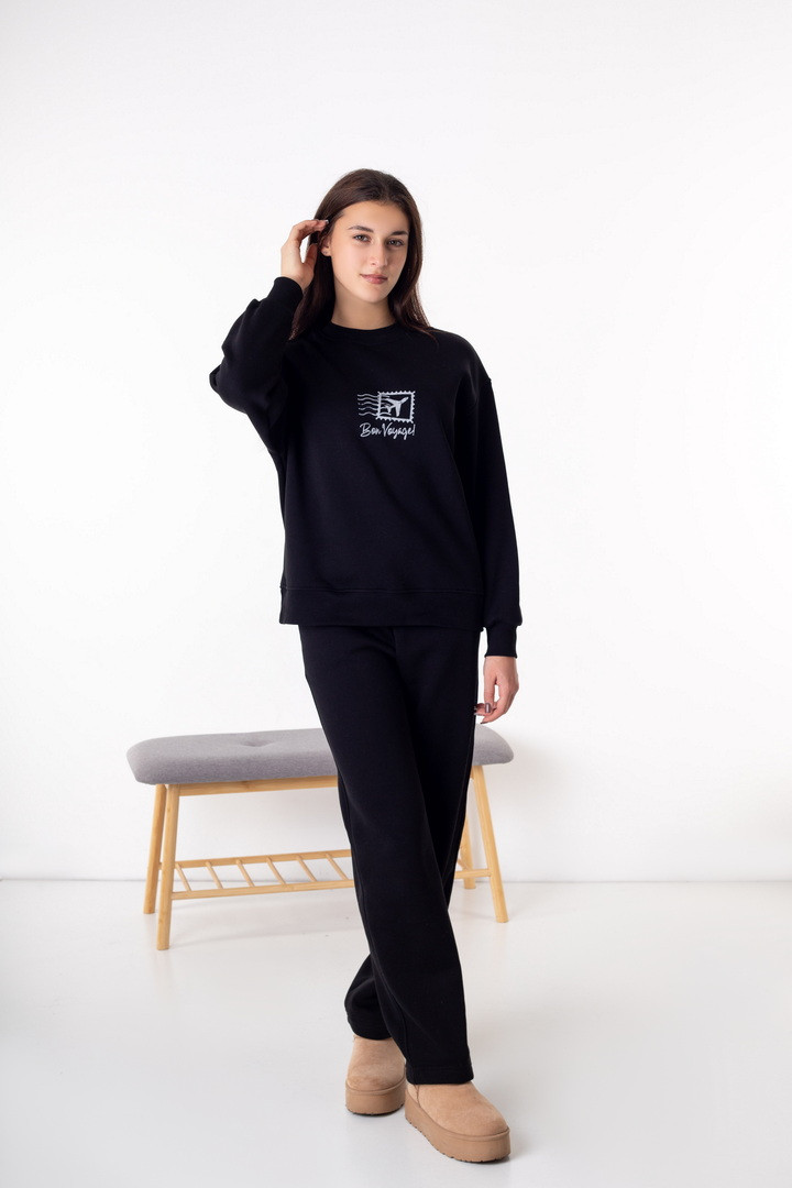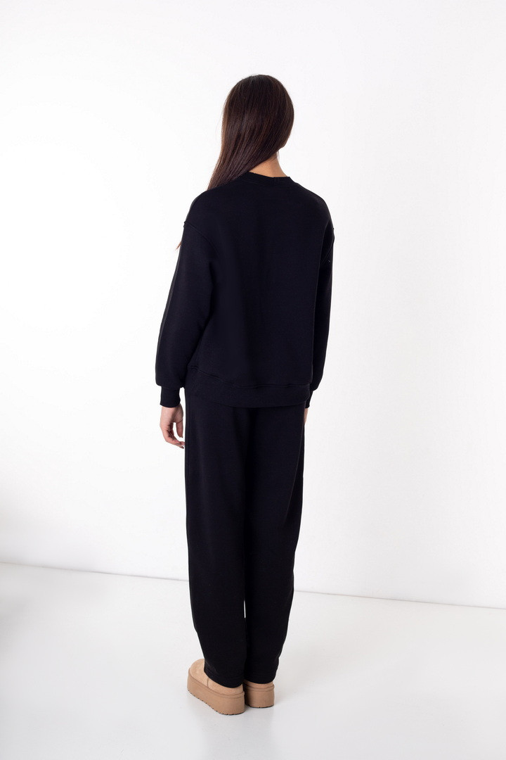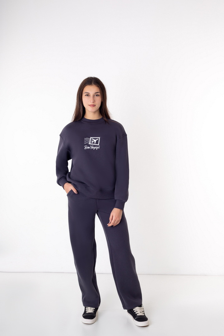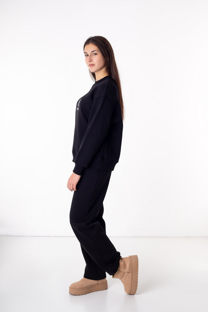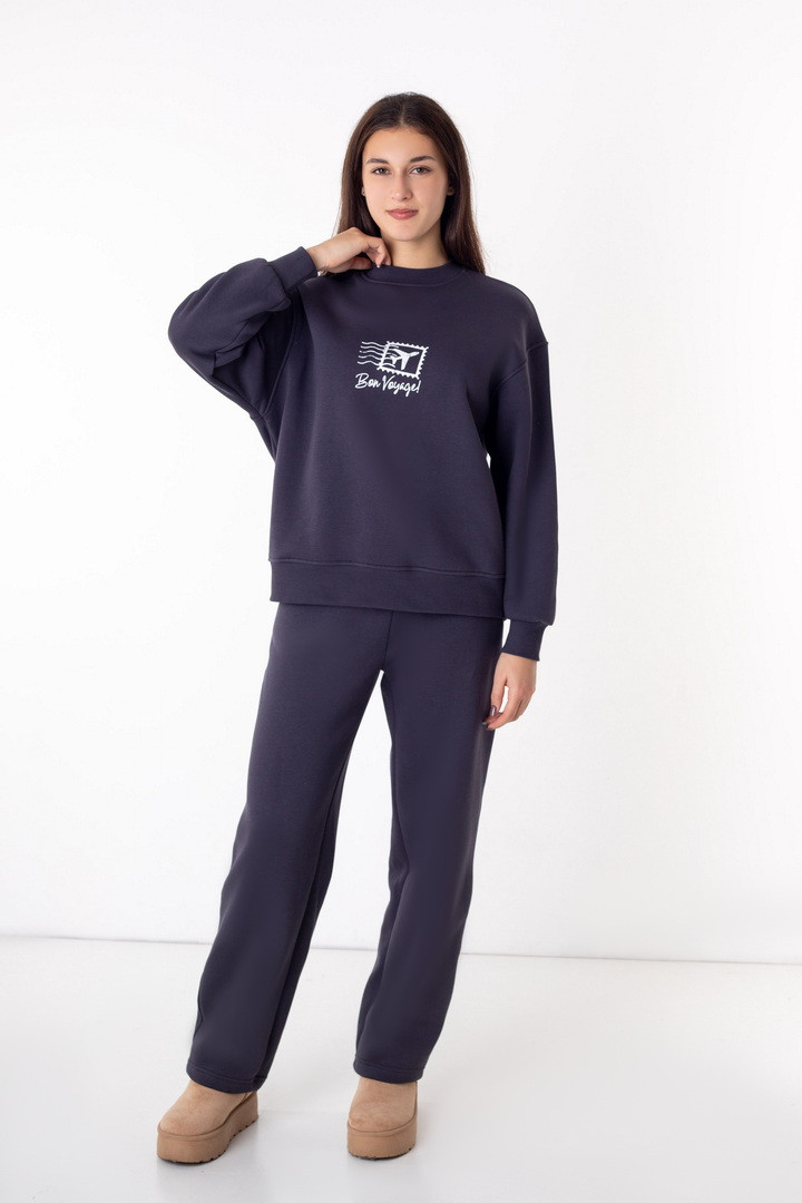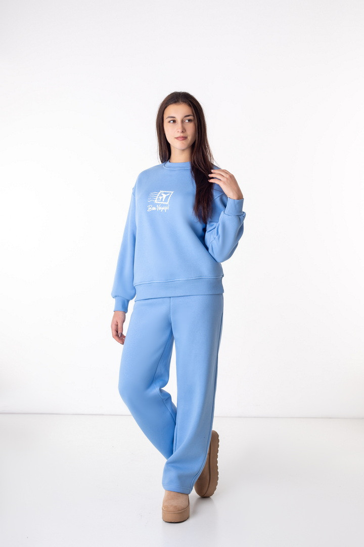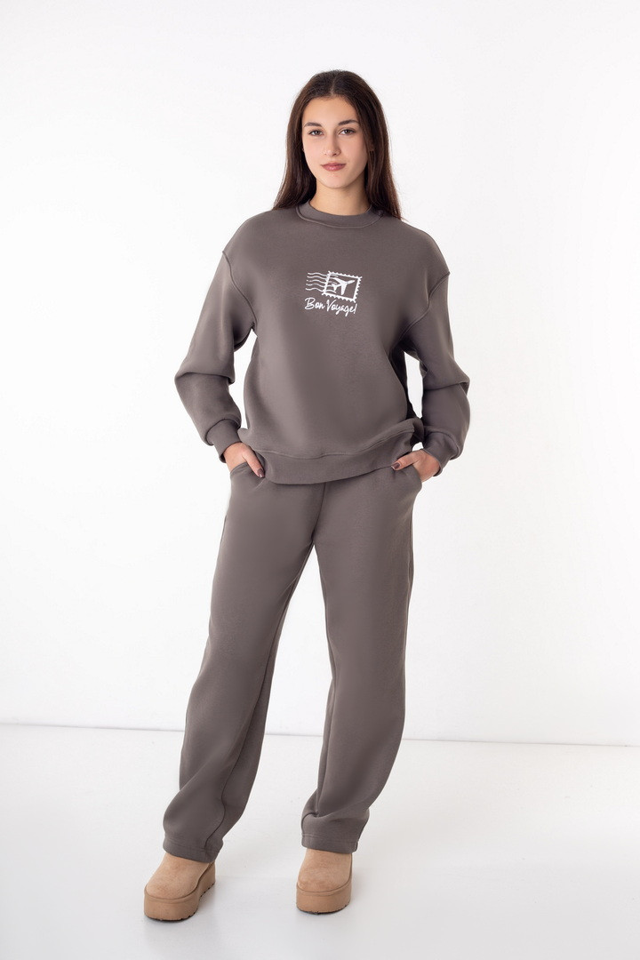 Стильний жіночий костюм із триниткового футера з начосом, створений для максимального комфорту та легкості. Комплект складається зі світшота прямого вільного крою та брюк із м’якої, гладкої тканини. Світшот має опущену лінію плеча, еластичні манжети та пояс, що забезпечують зручну посадку та зберігають форму виробу. Спереду розміщений лаконічний принт, який додає образу індивідуальності. Штани мають пряму, трохи вільну посадку, комфортний пояс на резинці та рівні акуратні шви. Матеріал костюма приємний до тіла, добре тримає тепло, що робить його ідеальним варіантом для прохолодної погоди. Цей комплект поєднує практичність, стиль та зручність, створюючи невимушений сучасний образ.