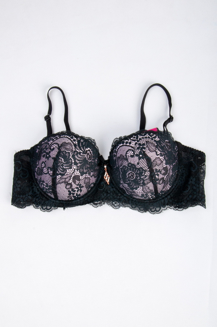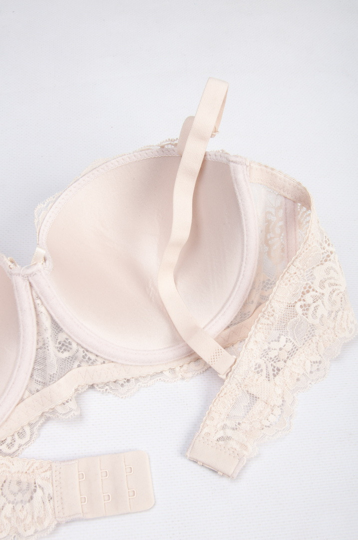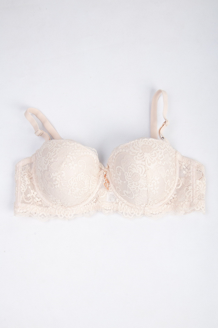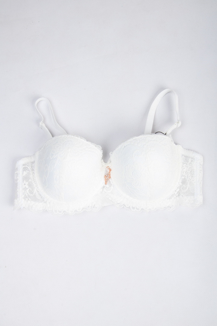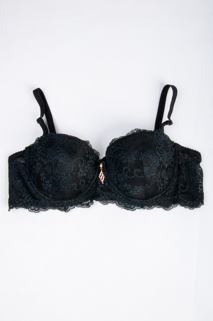 Бюстгальтер виконаний з мереживного матеріалу із квітковим візерунком. Чашки мають середній поролон для підтримки та надання форми грудей. Між чашками знаходиться декоративний елемент у вигляді підвіски з блискучими деталями, можливо стразами або імітацією каменів. Форма бюстгальтера "Анжеліка". Знімні бретелі із регулюванням по довжині. Застібка на 2 гачки та 3 подовження. Стильний і зручний варіант для відкритого вбрання.