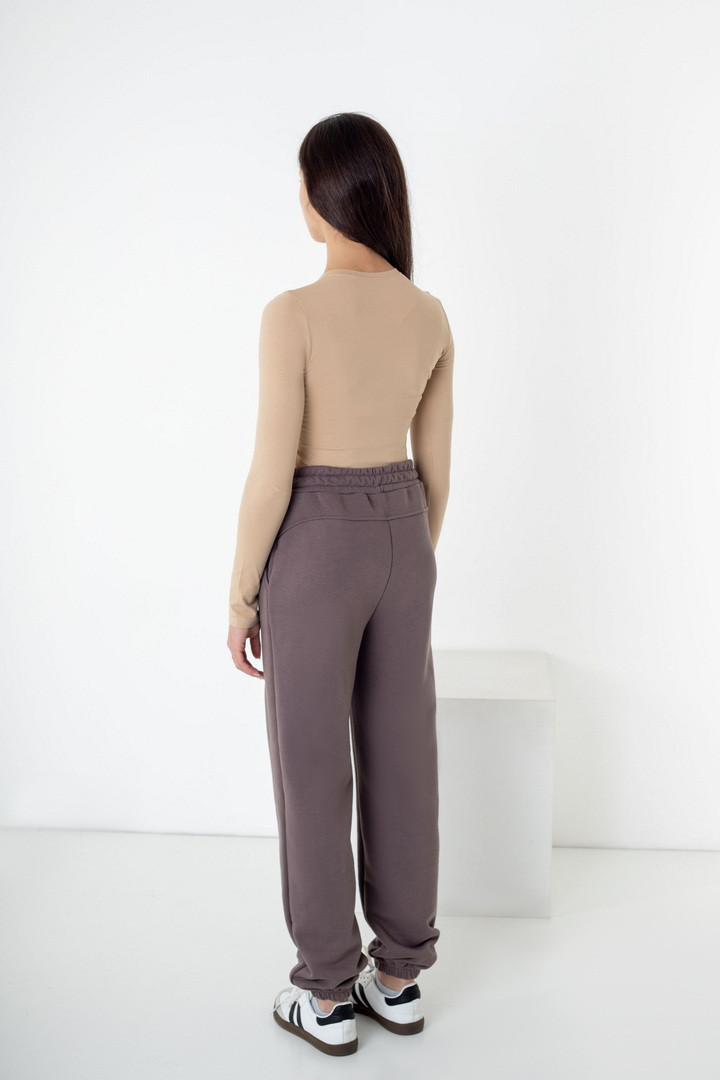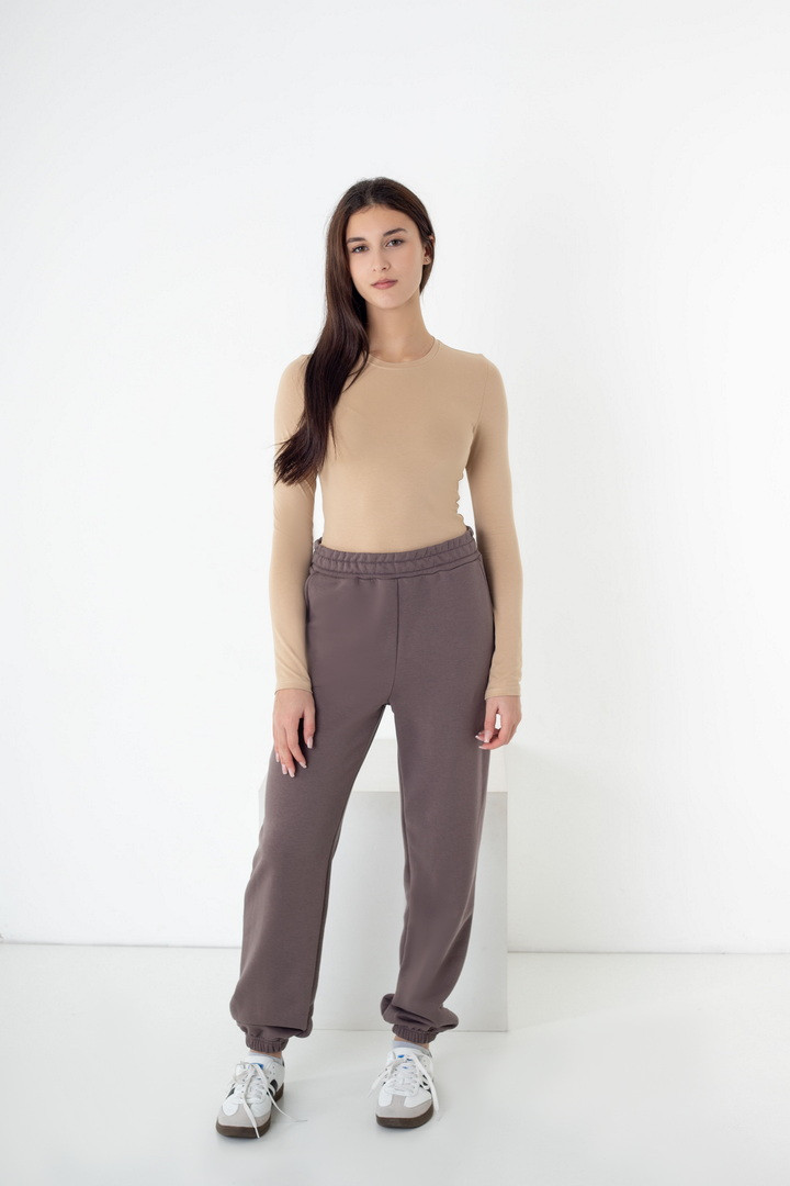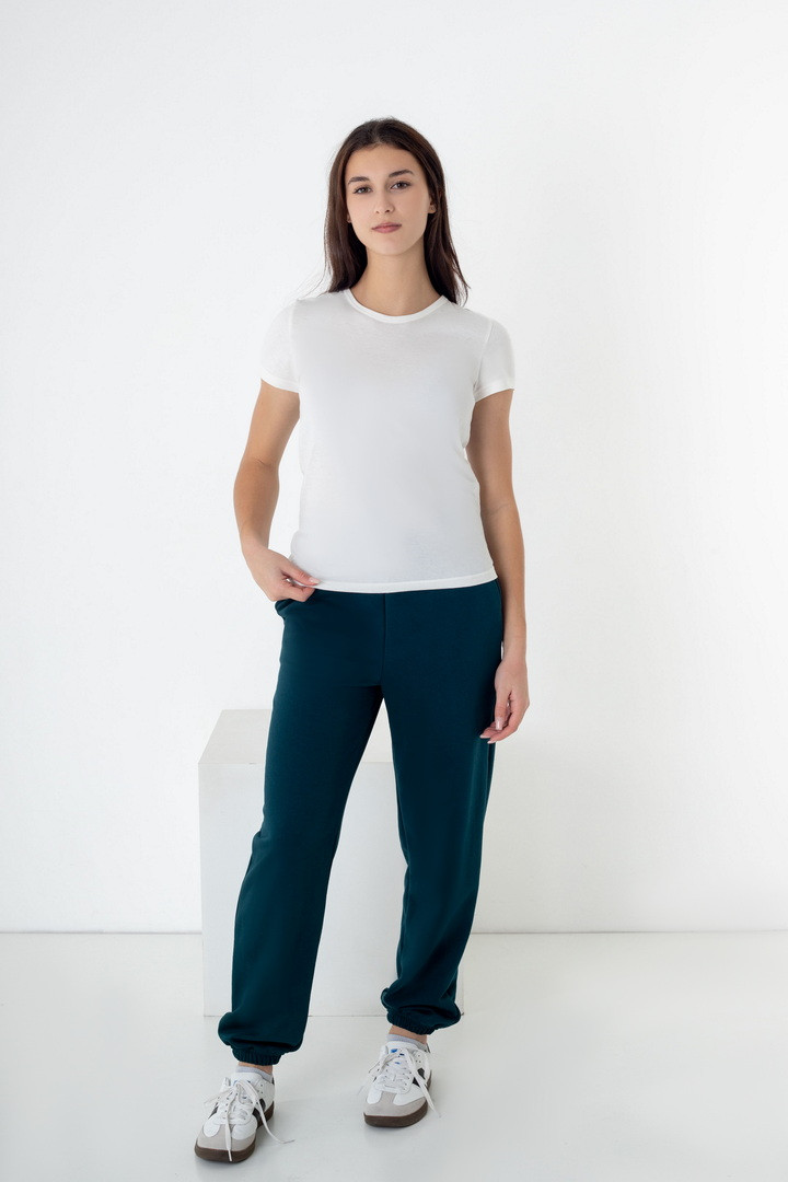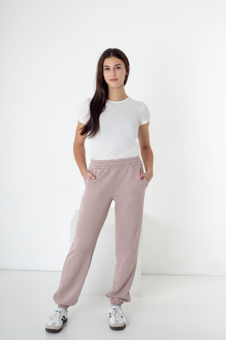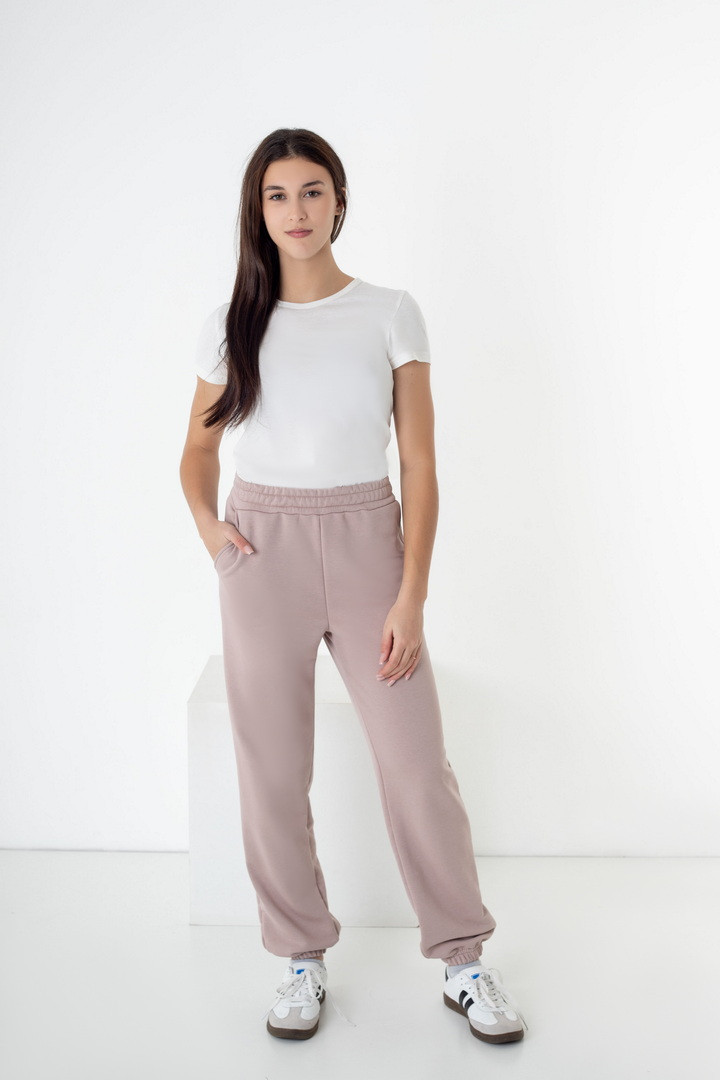 Жіночі штани з футера триниткового (петля) — це універсальний елемент повсякденного гардероба, який поєднує комфорт, практичність і сучасний мінімалістичний стиль. Штани виготовлені з футера триниткового типу «петля», що відрізняється підвищеною щільністю та зносостійкістю. З виворітного боку, матеріал має характерну петельну структуру без начісу, завдяки чому тканина добре пропускає повітря, не перегріває та приємна до тіла. Полотно м’яке, еластичне, добре тримає форму. Модель має прямий, злегка вільний крій. Еластичний пояс на резинці забезпечує надійну посадку на талії без тиску. З боків розташовані функціональні кишені, що додають практичності та завершують сучасний casual-образ. Низ штанів оформлений манжетами на резинці, які фіксують довжину та надають виробу гарного вигляду. Модель створена для активного життя, відпочинку, забезпечуючи максимальну зручність у будь-яку пору року.