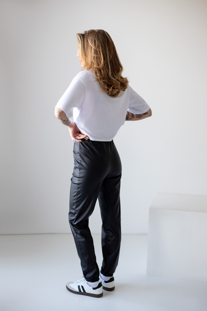 Стиль та зручність – це те, що в собі поєднують штани, з приємним до тіла полотном "Екошкіра". Ця модель штанів, трохи звужених до низу, має високу посадку, штани внизу на резинці. "Екошкіра" не тільки тримається в модних трендах щороку, а й стала вічною класикою – тому такі штани можна використовувати будь-де, чи то в школу, чи на прогулянку, чи на інший захід. Модель із бічними кишенями, пояс на резинці, для зручності використання усередині вставлений шнурок.