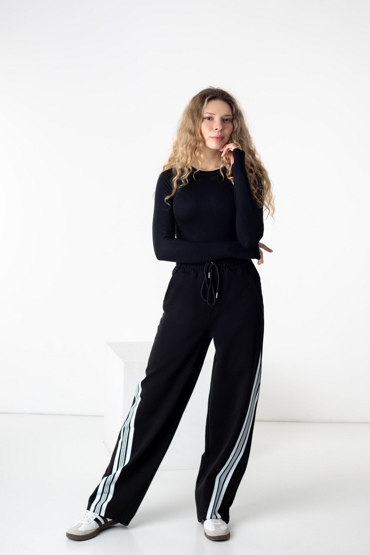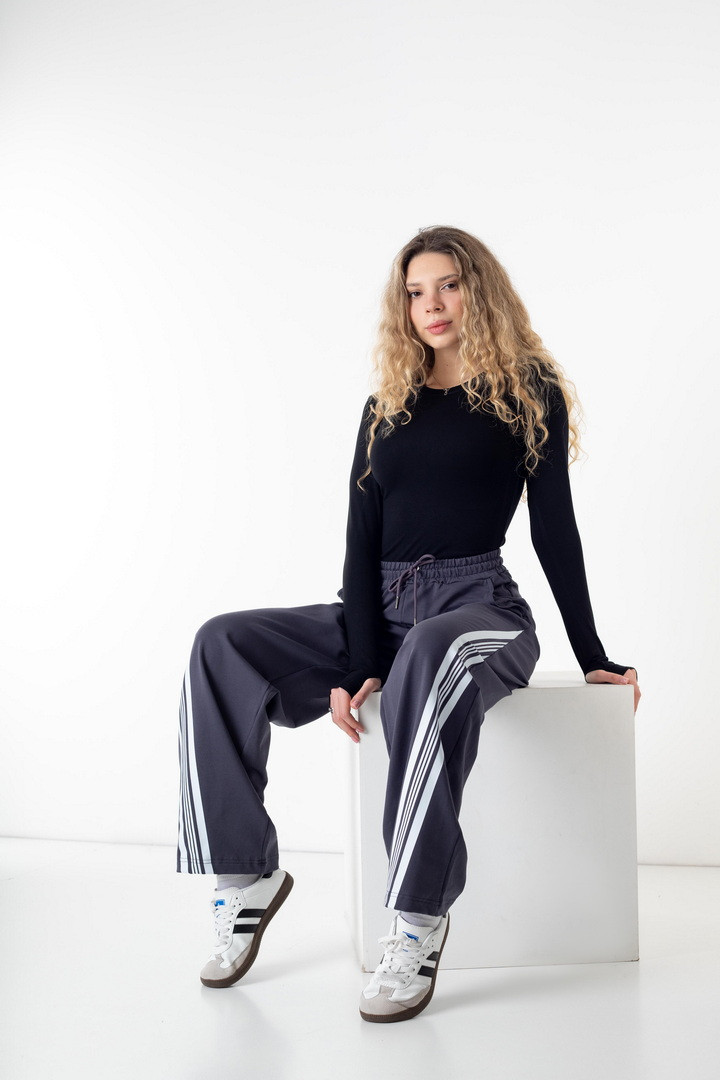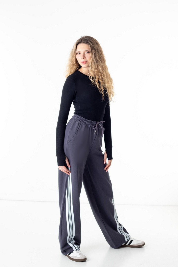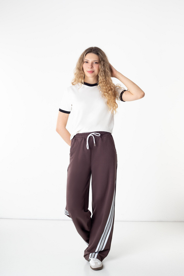 Ці жіночі штани з двониткового футера — ідеальне поєднання комфорту, сучасного стилю та продуманого дизайну. Вони створені для тих, хто цінує свободу, але не готовий відмовлятися від трендового вигляду. Модель має вільний прямий крій, який красиво витягує силует і додає образу легкості. Особливий акцент — контрастні лампаси з боків, що візуально подовжують ноги та надають штанам динамічного, спортивного характеру. Штани виглядають стримано та водночас стильно, легко поєднуючись як із базовими речами, так і з більш яскравими елементами гардеробу. Двонитковий футер — це ідеальний вибір для демісезону: тканина м’яка, приємна до тіла, добре тримає форму. Еластичний пояс із шнурком забезпечує ідеальну посадку, а зручні кишені додають практичності у щоденному використанні. Ці штани легко адаптуються під твій ритм життя: прогулянки містом, активний день, подорожі або стильні casual-образи — вони завжди «в тему».