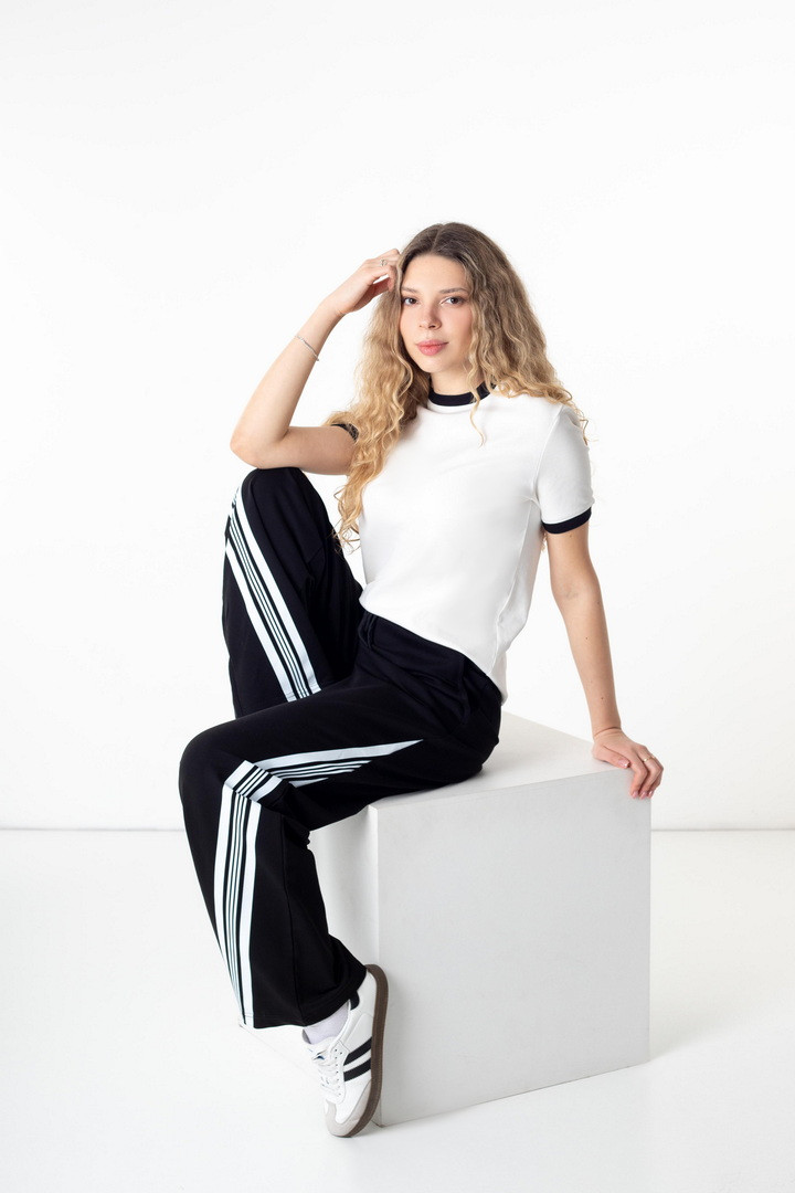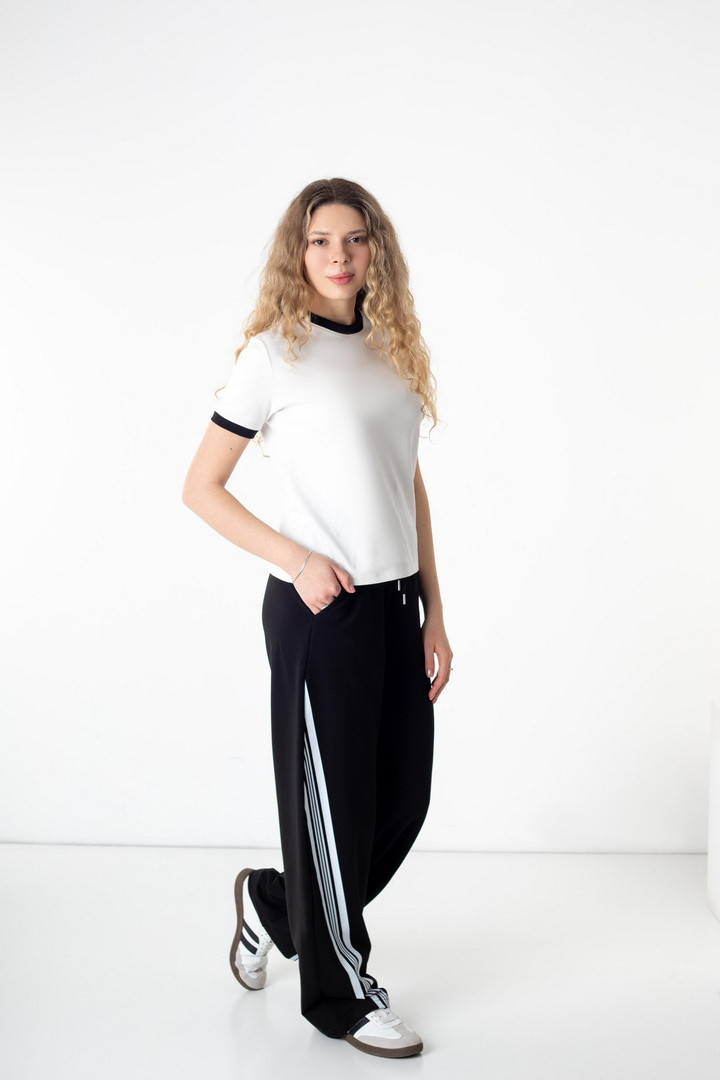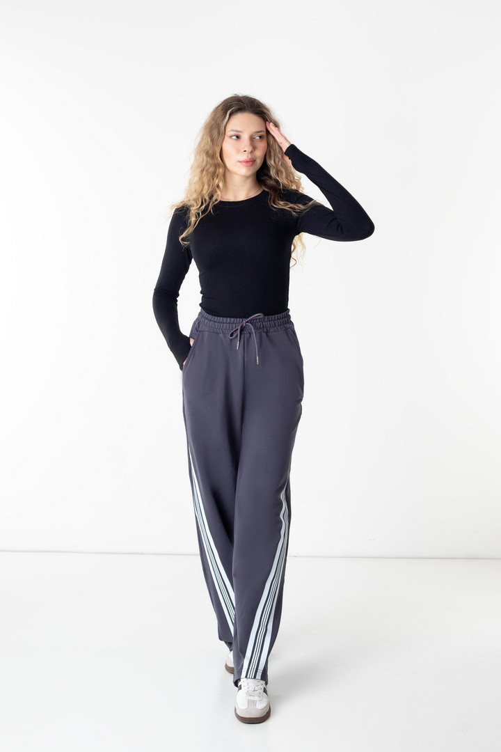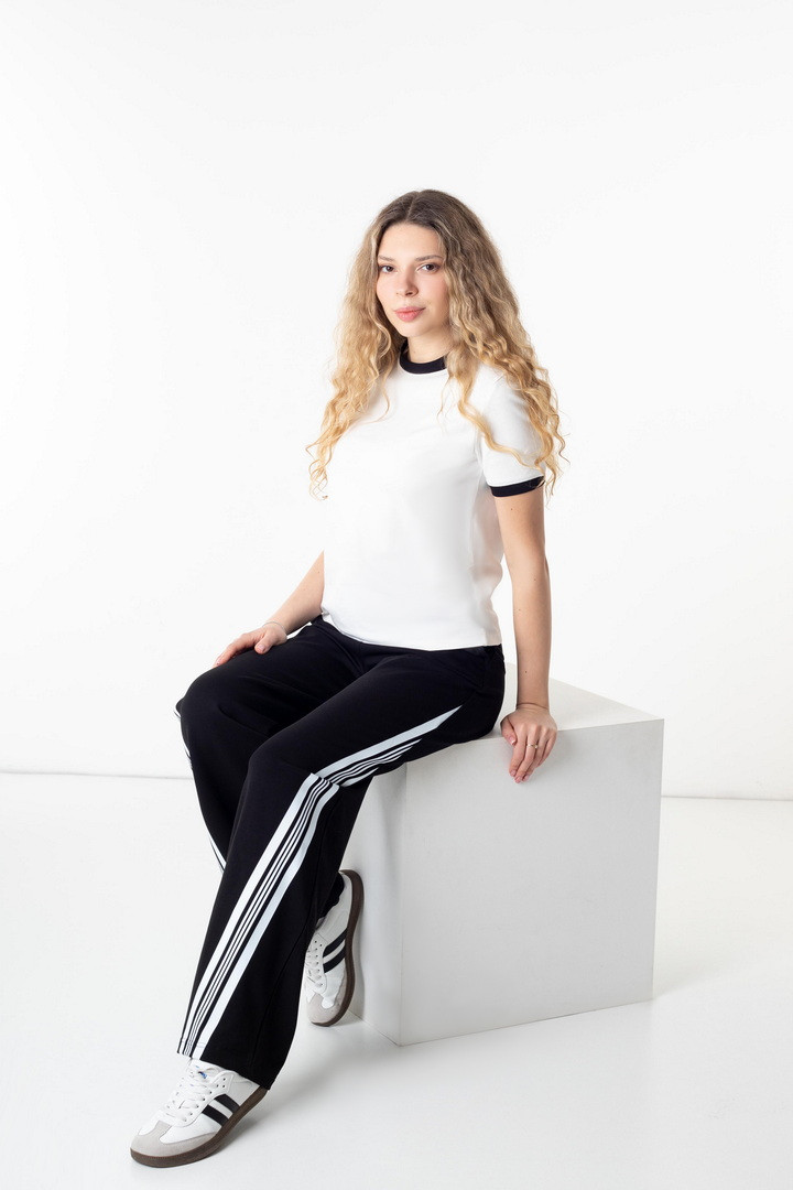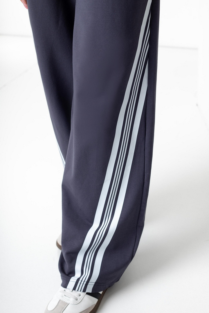 Ці жіночі штани з двониткового футера — ідеальне поєднання комфорту, сучасного стилю та продуманого дизайну. Вони створені для тих, хто цінує свободу, але не готовий відмовлятися від трендового вигляду. Модель має вільний прямий крій, який красиво витягує силует і додає образу легкості. Особливий акцент — контрастні лампаси з боків, що візуально подовжують ноги та надають штанам динамічного, спортивного характеру. Штани виглядають стримано та водночас стильно, легко поєднуючись як із базовими речами, так і з більш яскравими елементами гардеробу. Двонитковий футер — це ідеальний вибір для демісезону: тканина м’яка, приємна до тіла, добре тримає форму. Еластичний пояс із шнурком забезпечує ідеальну посадку, а зручні кишені додають практичності у щоденному використанні. Ці штани легко адаптуються під твій ритм життя: прогулянки містом, активний день, подорожі або стильні casual-образи — вони завжди «в тему».
